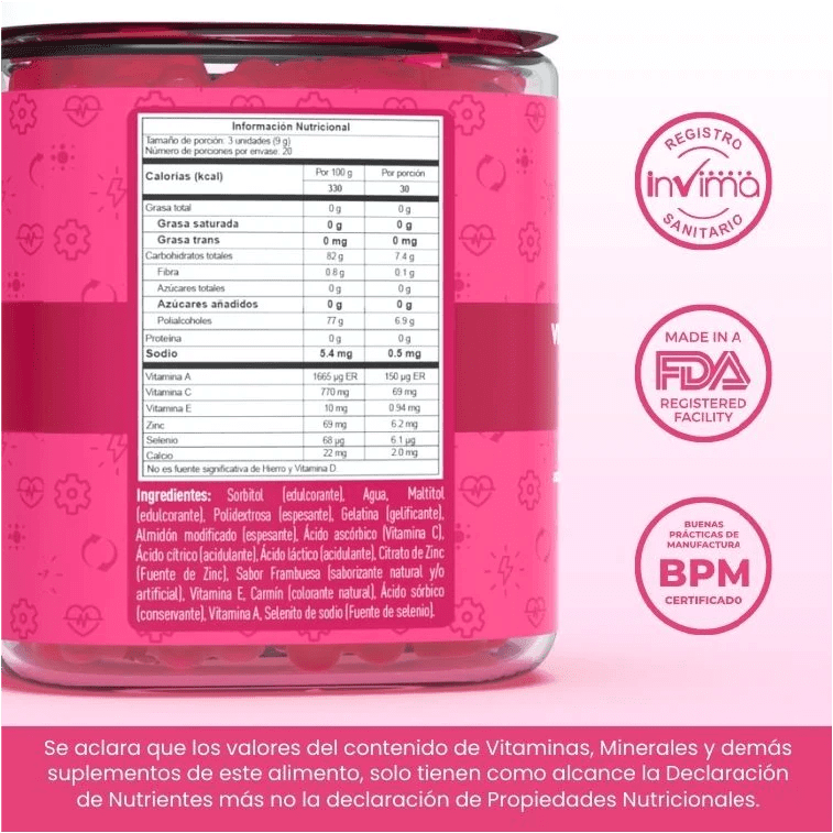 La vitamina A apoya la salud visual y la integridad de la piel, la vitamina C fortalece tu sistema inmunológico y promueve la producción de colágeno, mientras que la vitamina E protege tus células del estrés oxidativo. Juntas contribuyen a mantener una piel radiante, un sistema inmune fuerte y una salud óptima.